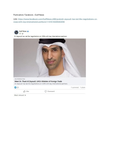 Publication: Facebook – Gulf News Link: https://www.facebook.com/GulfNews.UAE/posts/dr-zeyoudi-has-led-the-negotiations-on- cepa-with-key-international-partners/1151515020340209/