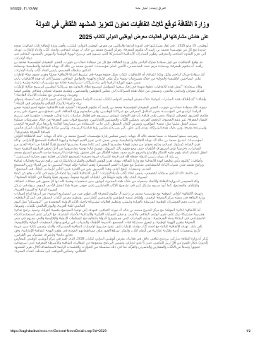 نوﺎﻌﺗ تﺎﯿﻗﺎﻔﺗا ثﻼﺛ ﺔﻓﺎﻘﺜﻟا ةرازو ﺖﻌﻗو ،بﺎﺘﻜﻠﻟ ﻲﻟوﺪﻟا ﻲﺒظﻮﺑأ ضﺮﻌﻣ ﻦﻣ ﻦﯿﺛﻼﺜﻟاو ﺔﻌﺑاﺮﻟا ةروﺪﻟا ﻲﻓ ﺎﮫﺘﻛرﺎﺸﻣ رﺎطإ ﻲﻓ : 2025 ﻮﻳﺎﻣ 15 ،ﻲﺒظﻮﺑأ