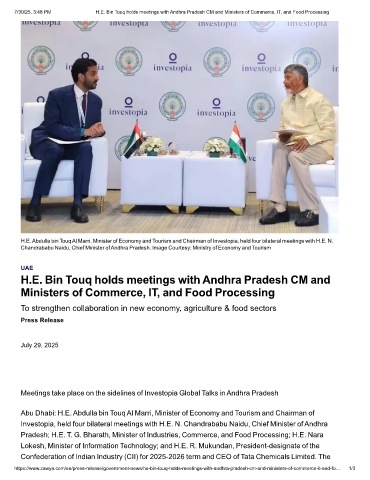 7/30/25, 3:48 PM H.E. Bin Touq holds meetings with Andhra Pradesh CM and Ministers of Commerce, IT, and Food Processing