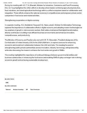 7/30/25, 3:48 PM H.E. Bin Touq holds meetings with Andhra Pradesh CM and Ministers of Commerce, IT, and Food Processing