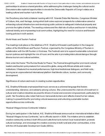 7/29/25, 4:26 PM Shaikha Al Nowais meets with President of Congo to explore future partnerships in culture, tourism, and sustainable development