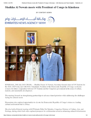 KINSHASA, 28th July 2025 (WAM) — Shaikha Nasser Al Nowais, Secretary-General-elect of UN Tourism for