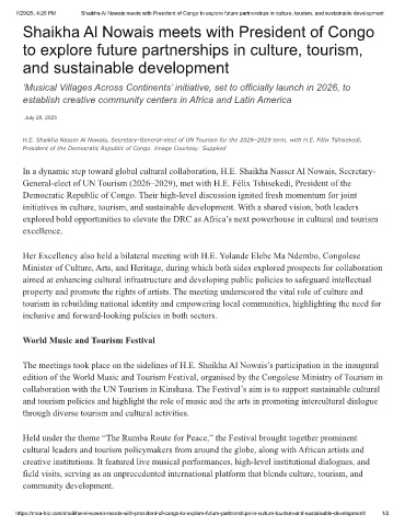 7/29/25, 4:26 PM Shaikha Al Nowais meets with President of Congo to explore future partnerships in culture, tourism, and sustainable development