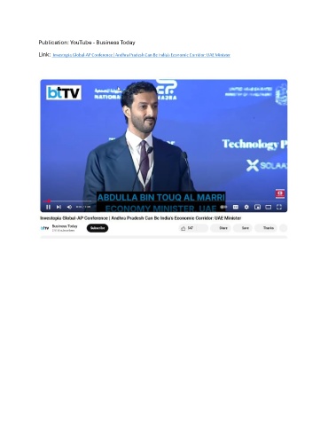 Publication: YouTube - Business Today Link: Investopia Global-AP Conference | Andhra Pradesh Can Be India’s Economic Corridor: UAE Minister