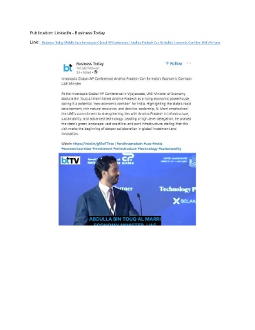 Publication: LinkedIn - Business Today Link: - Business Today Middle East: Investopia Global-AP Conference | Andhra Pradesh Can Be India’s Economic Corridor: UAE Minister
