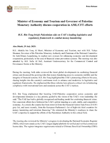 H.E. Bin Touq briefs Palestinian side on UAE’s leading legislative and