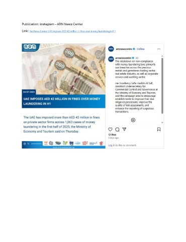 Publication: Instagram – ARN News Center Link: Arn News Center: UAE imposes AED 42 million in fines over money laundering in H1