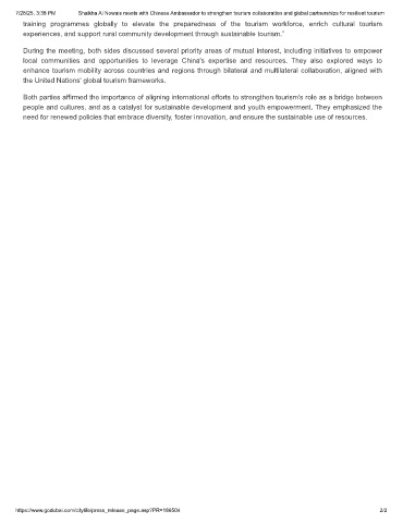 7/28/25, 3:38 PM Shaikha Al Nowais meets with Chinese Ambassador to strengthen tourism collaboration and global partnerships for resilient tourism