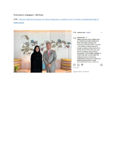 Publication: Instagram – Mid East Link: - Mid East: Shaikha Al Nowais meets with Chinese Ambassador to strengthen tourism collaboration and global partnerships for resilient tourism