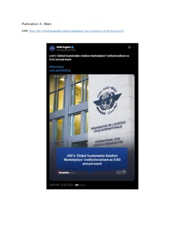 Publication: X - Wam Link: Wam: UAE’s ‘Global Sustainable Aviation Marketplace’ institutionalised as ICAO annual event