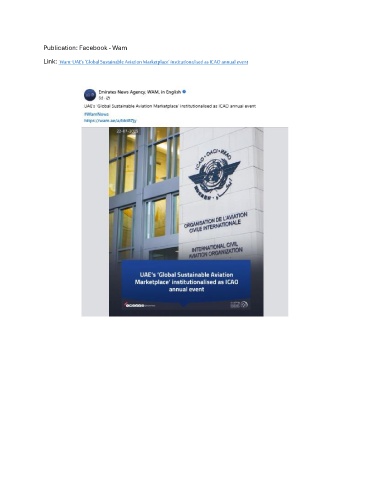 Publication: Facebook - Wam Link: Wam: UAE’s ‘Global Sustainable Aviation Marketplace’ institutionalised as ICAO annual event