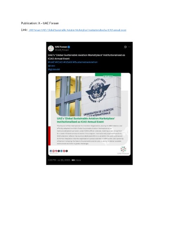 Publication: X – UAE Forsan Link: UAE Forsan: UAE’s ‘Global Sustainable Aviation Marketplace’ institutionalised as ICAO annual event
