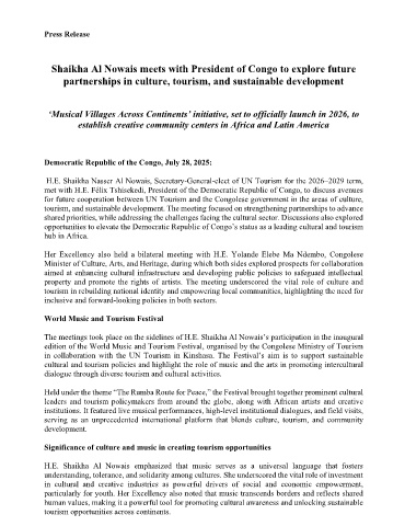 for future cooperation between UN Tourism and the Congolese government in the areas of culture,