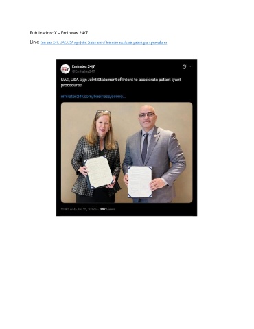 Publication: X – Emirates 24/7 Link: Emirates 247: UAE, USA sign Joint Statement of Intent to accelerate patent grant procedures