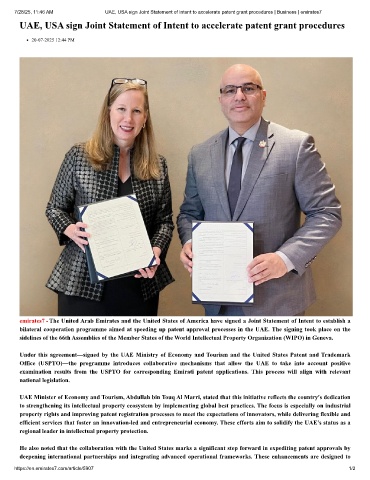 7/28/25, 11:46 AM UAE, USA sign Joint Statement of Intent to accelerate patent grant procedures | Business | emirates7