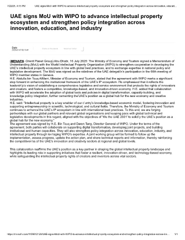 https://menafn.com/1109812129/UAE-signs-MoU-with-WIPO-to-advance-intellectual-property-ecosystem-and-strengthen-policy-integration-across-inn… 1/1
