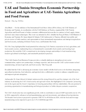 7/17/25, 2:47 PM UAE and Tunisia Strengthen Economic Partnership in Food and Agriculture at UAE-Tunisia Agriculture and Food Forum - Technolo…