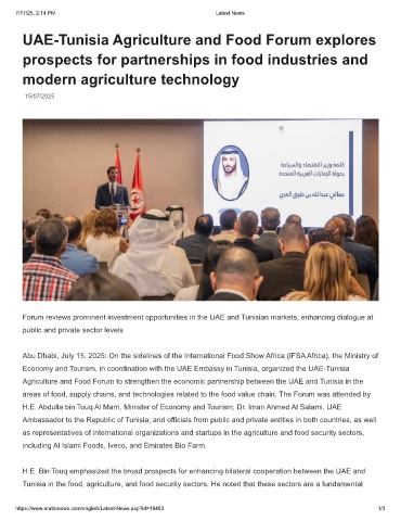 Agriculture and Food Forum to strengthen the economic partnership between the UAE and Tunisia in the