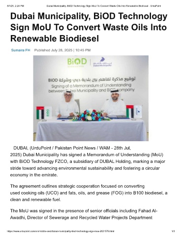8/1/25, 2:24 PM Dubai Municipality, BiOD Technology Sign MoU To Convert Waste Oils Into Renewable Biodiesel - UrduPoint