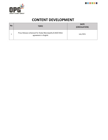 CONTENT DEVELOPMENT DATE No. TOPIC (CIRCULATION) Press Release enhanced for Dubai Municipality & BiOD MoU 1 July 2025 agreement in English