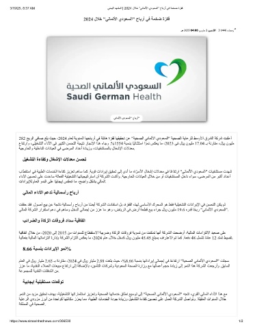 282 ﺢﺑﺮﻟا ﻲﻓﺎﺻ ﻎﻠﺑ ﺚﯿﺣ ،2024 مﺎﻌﻟ ﺔﯾﻮﻨﺴﻟا ﺎﮭﺣﺎﺑرأ ﻲﻓ ﺔﻠﺋﺎھ ةﺰﻔﻗ ﺎﮭﻘﯿﻘﺤﺗ ﻦﻋ "ﺔﯿﺤﺼﻟا ﻲﻧﺎﻤﻟﻷا يدﻮﻌﺴﻟا" ﺔﯿﺤﺼﻟا ﺔﯾﺎﻋﺮﻠﻟ ﻂﺳوﻷا قﺮﺸﻟا ﺔﻛﺮﺷ ﺖﻨﻠﻋأ