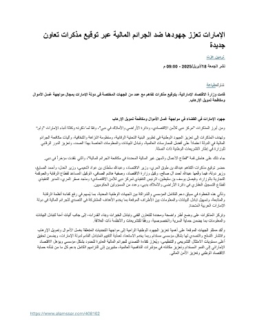 نواعت تاركذم عيقوت ربع ةيلاملا مئارجلا دض اهدوهج ززعت تاراملإا