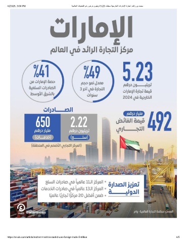 4/23/25, 3:04 PM ﺔﯾﻣﻟﺎﻌﻟا تﺎﯾدﺣﺗﻟا مﻏر مھرد نوﯾﻠﯾرﺗ 5.23 تﻠﺟﺳ ﺔﯾﺟرﺎﺧﻟا تارﺎﻣﻹا ةرﺎﺟﺗ :دﺷار نﺑ دﻣﺣﻣ https://al-ain.com/article/mohammed-bin-rashid-uae-foreign-trade-5-trillion 4/5