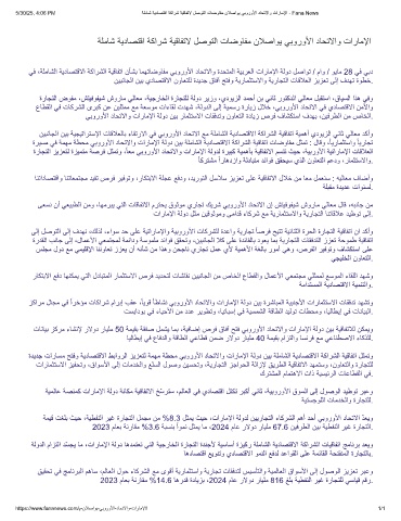 ةرﯾﺳﻣ ﻲﻓ ﺔﻣﮭﻣ ﺔطﺣﻣ ﻲﺑوروﻷا دﺎﺣﺗﻻاو تارﺎﻣﻹا ﺔﻟود نﯾﺑ ﺔﻠﻣﺎﺷﻟا ﺔﯾدﺎﺻﺗﻗﻻا ﺔﻛارﺷﻟا ﺔﯾﻗﺎﻔﺗا تﺎﺿوﺎﻔﻣ لﺛﻣﺗ : لﺎﻗو ،ً ﺎﯾرﺎﻣﺛﺗﺳاو ً ﺎﯾرﺎﺟﺗ