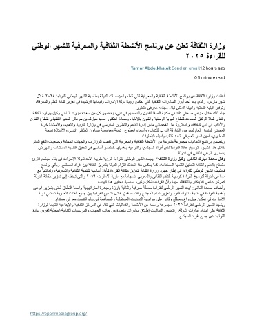 للاخ ٢٠٢٥ ةءارقلل ينطولا رهشلا ةبسانمب ةلودلا تاسسؤم اهمظنت يتلا ةيفرعملاو ةيفاقثلا ةطشنلأا جمانرب نع ةفاقثلا ةرازو تنلعأ