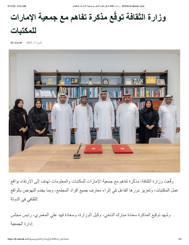 3/14/25, 9:45 AM تﺎﺑﺗﻛﻣﻠﻟ تارﺎﻣﻹا ﺔﯾﻌﻣﺟ ﻊﻣ مھﺎﻔﺗ ةرﻛذﻣ ﻊ ّ ﻗوﺗ ﺔﻓﺎﻘﺛﻟا ةرازو – WWW.kl-alarab.com