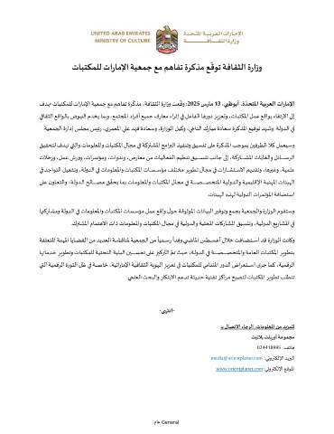 فﺪ�� تﺎﺒﺘﻜﻤﻠﻟ تارﺎﻣﻹا ﺔﻴﻌﻤﺟ ﻊﻣ ﻢهﺎﻔﺗ ةﺮﻛﺬﻣ ،ﺔﻓﺎﻘﺜﻟا ةرازو ﺖﻌﻗو : 2025 سرﺎﻣ 13 ،ي�ﻇﻮﺑأ ،ةﺪﺤﺘﳌا ﺔﻴ�ﺮﻌﻟا تارﺎﻣﻹا