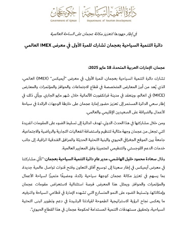 ، ﻲﻤﻟﺎﻌﻟا ( IMEX ) "ﺲﻜﻴﻤﻳآ" ضﺮﻌﻣ ي ﻓ ،ى ﻟوﻷا ةﺮﻤﻠﻟ ،نﺎﻤﺠﻌﺑ ﺔﻴﺣﺎﻴﺴﻟا ﺔﻴﻤﻨﺘﻟا ةﺮﺋاد كرﺎﺸﺗ