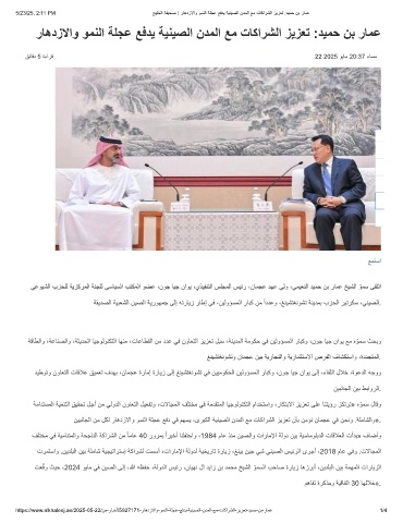 https://www.alkhaleej.ae/2025-05-22/نﻣ-رﺎﺑﺧأ/5927171-رﺎھدزﻻاو-وﻣﻧﻟا-ﺔﻠﺟﻋ-ﻊﻓدﯾ-ﺔﯾﻧﯾﺻﻟا-ندﻣﻟا-ﻊﻣ-تﺎﻛارﺷﻟا-زﯾزﻌﺗ-دﯾﻣﺣ-نﺑ-رﺎﻣﻋ 1/4