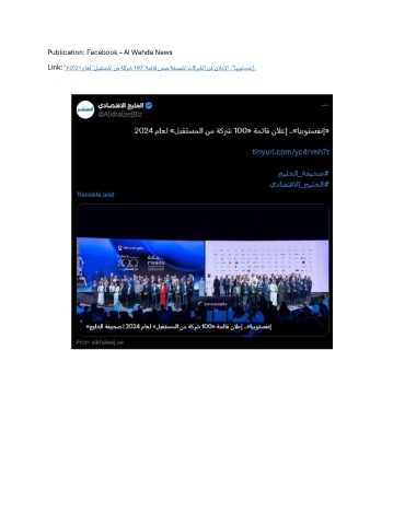 Publication: Facebook – Al Wahda News Link: "#2024 ماعل "لبقتسلما نم ةكرش 100" ةمئاق نمض ةفنصلما تاكرشلا نع نلاعلإا .."ايبوتسفنإ..