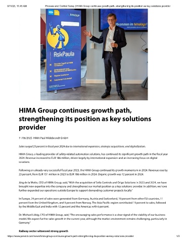 6/11/25, 11:45 AM Process and Control Today | HIMA Group continues growth path, strengthening its position as key solutions provider