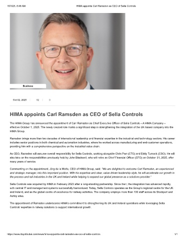 10/3/25, 8:48 AM HIMA appoints Carl Ramsden as CEO of Sella Controls
