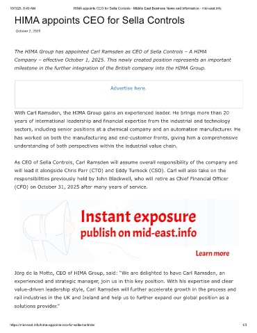 10/3/25, 8:49 AM HIMA appoints CEO for Sella Controls - Middle East Business News and Information - mid-east.info