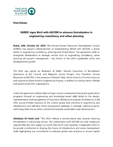 EHRDC signs MoU with AECOM to advance Emiratisation in