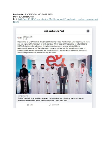 Publication: FACEBOOK- MID EAST INFO Date: 20 October 2025 Link: Mid-East: EHRDC and e& sign MoU to support Emiratisation and develop national talent