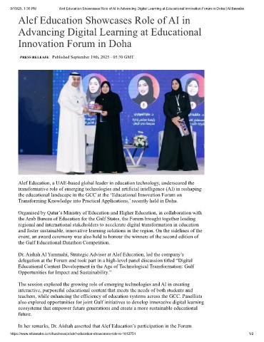 9/19/25, 1:36 PM Alef Education Showcases Role of AI in Advancing Digital Learning at Educational Innovation Forum in Doha | Al Bawaba