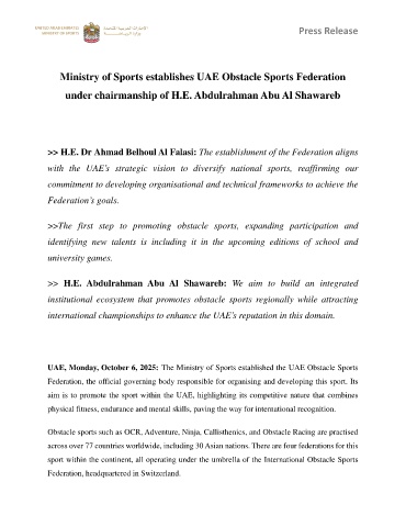 UAE, Monday, October 6, 2025: The Ministry of Sports established the UAE Obstacle Sports