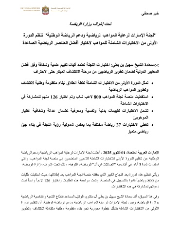 ﺔﺿﺎﯾﺮﻟا ﻢﻋدو ﺔﯿﺿﺎﯾﺮﻟا ﺐھاﻮﻤﻟا ﺔﯾﺎﻋﺮﻟ تارﺎﻣﻹا ﺔﻨﺠﻟ ﺖﻨﻠﻋأ - 2025 ﺮﺑﻮﺘﻛأ 01 ،ةﺪﺤﺘﻤﻟا ﺔﯿﺑﺮﻌﻟا تارﺎﻣﻹا