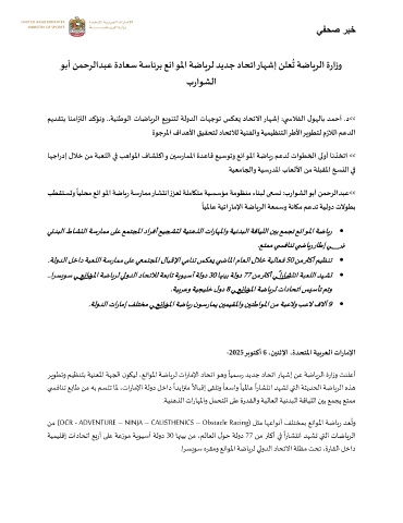 ﺮ�ﻮﻄﺗو ﻢﻴﻈﻨتﺑ ﺔﻴﻨﻌﳌا ﺔهج�ا نﻮ�ﻴﻟ ،ﻊ�اﻮﳌا ﺔﺿﺎ�ﺮﻟ تارﺎﻣﻹا دﺎﺤﺗا ﻮهو ﺎﻴﻤﺳر ﺪﻳﺪﺟ دﺎﺤﺗا رﺎهﺷإ ﻦﻋ ﺔﺿﺎ�ﺮﻟا ةرازو ﺖﻨﻠﻋأ