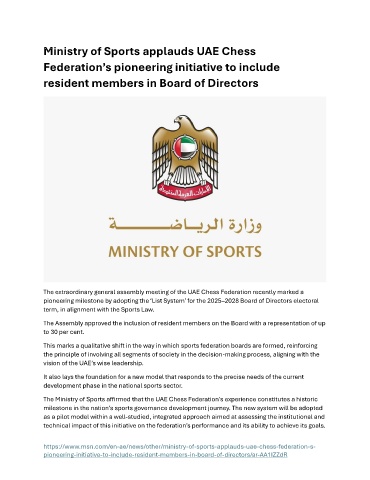 The Ministry of Sports affirmed that the UAE Chess Federation's experience constitutes a historic