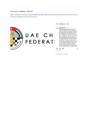 Publication: Instagram – Mid East Link: - Mid-East: Ministry of Sports applauds UAE Chess Federation’s pioneering initiative to include resident members in Board of Directors