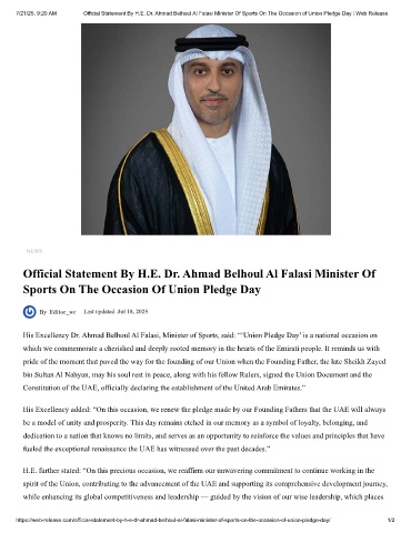 7/21/25, 9:20 AM    Official Statement By H.E. Dr. Ahmad Belhoul Al Falasi Minister Of Sports On The Occasion of Union Pledge Day | Web Release