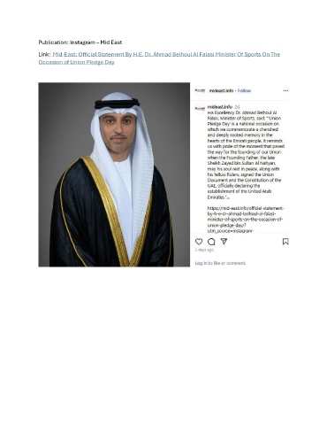 Publication: Instagram – Mid East Link: Mid-East: Official Statement By H.E. Dr. Ahmad Belhoul Al Falasi Minister Of Sports On The Occasion of Union Pledge Day