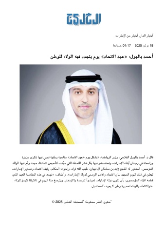 ةﺰﻳﺰﻋ ىﺮﻛذ ﺎﻬﻴﻓ ﻴﺤﻧ ﺔﻴﻨﻃو ﺔﺒﺳﺎﻨﻣ «دﺎﺤﺗﻻا ﺪﻬﻋ» مﻮﻳ ﻞﺸﻳ» :ﺔﺿﺎﻳﺮﻟا ﺮﻳزو ،ﺳﻼﻔﻟا لﻮﻬﻟﺎﺑ ﺪﻤﺣأ .د لﺎﻗ