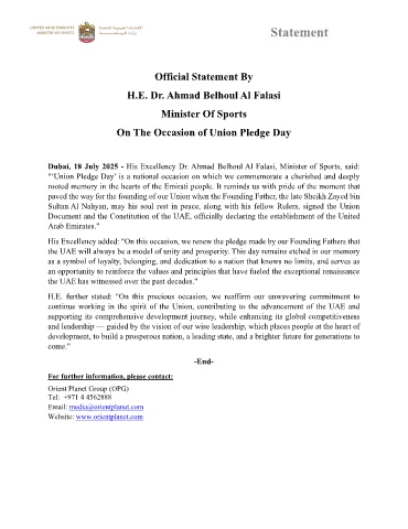 Dubai, 18 July 2025 - His Excellency Dr. Ahmad Belhoul Al Falasi, Minister of Sports, said: