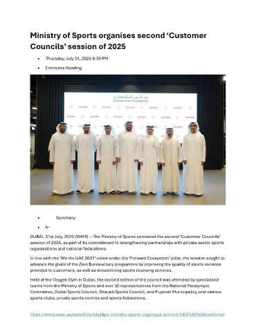 DUBAI, 31st July, 2025 (WAM) -- The Ministry of Sports convened the second ‘Customer Councils’